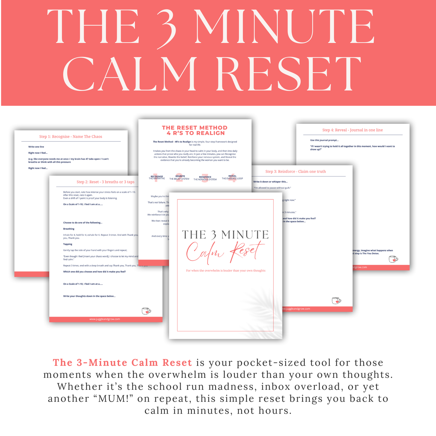 The 3-Minute Calm Reset is your pocket-sized tool for those moments when the overwhelm is louder than your own thoughts. Whether it’s the school run madness, inbox overload, or yet another “MUM!” on repeat, this simple reset brings you back to calm in minutes, not hours.