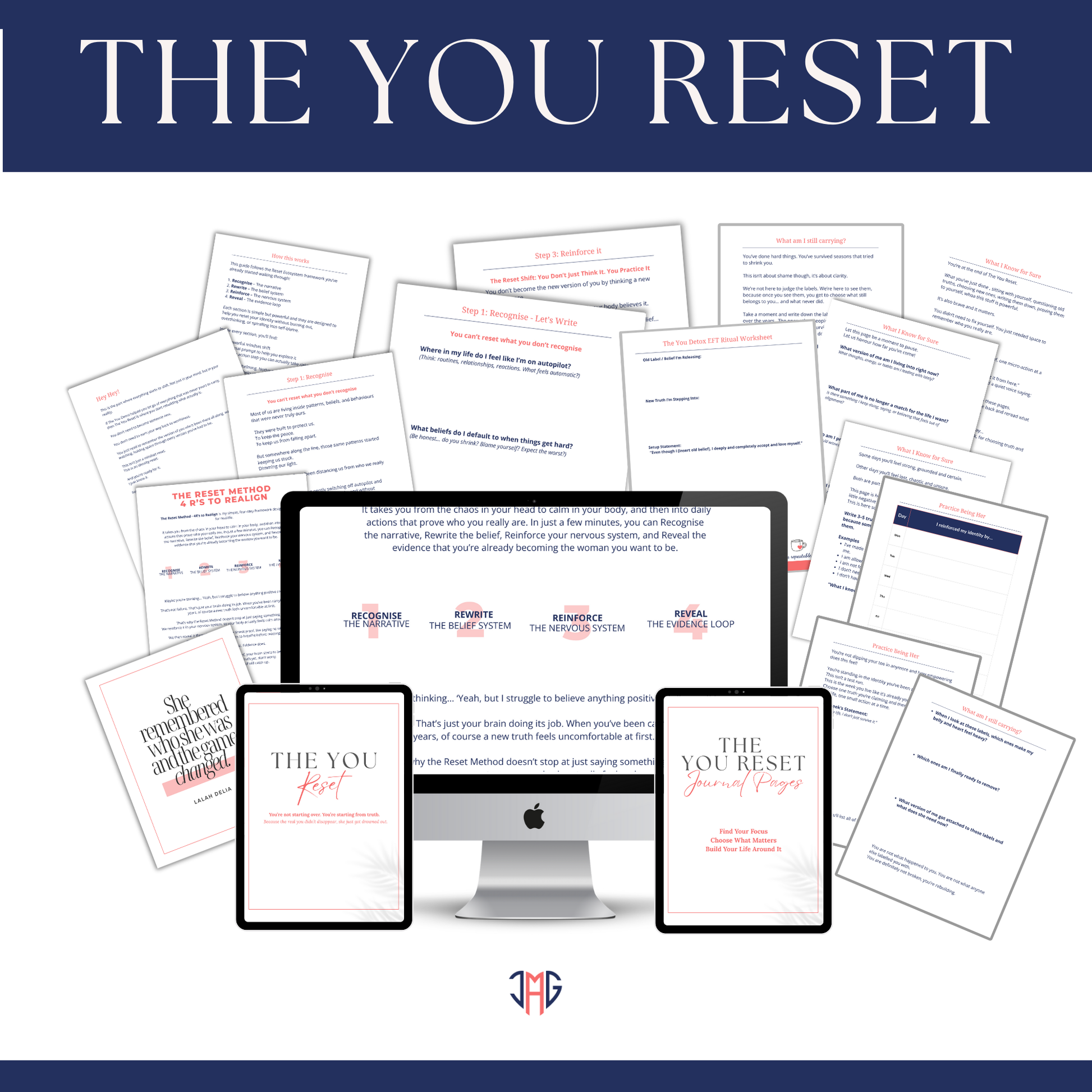 - The full Reset Ecosystem framework (Recognise, Rewrite, Reinforce, Reveal) applied to identity, beliefs, nervous system, and evidence